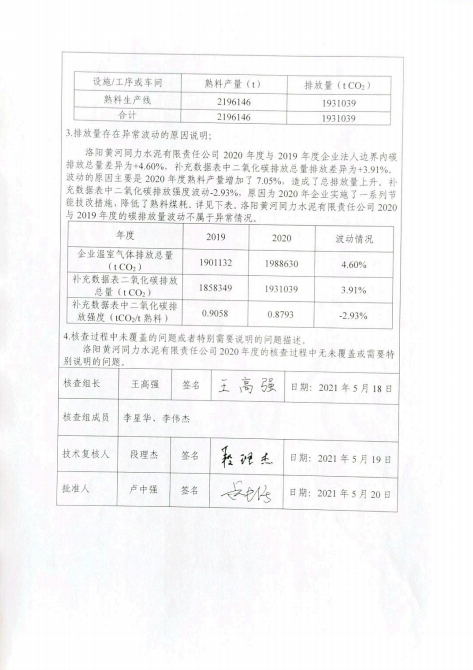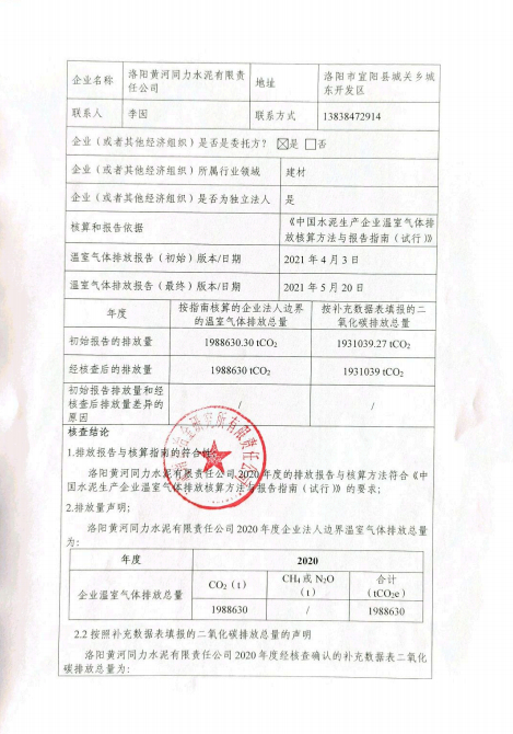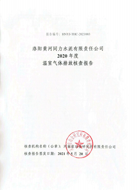 洛陽(yáng)黃河同力水泥有限責(zé)任公司2020年度溫室氣體排放核查報(bào)告